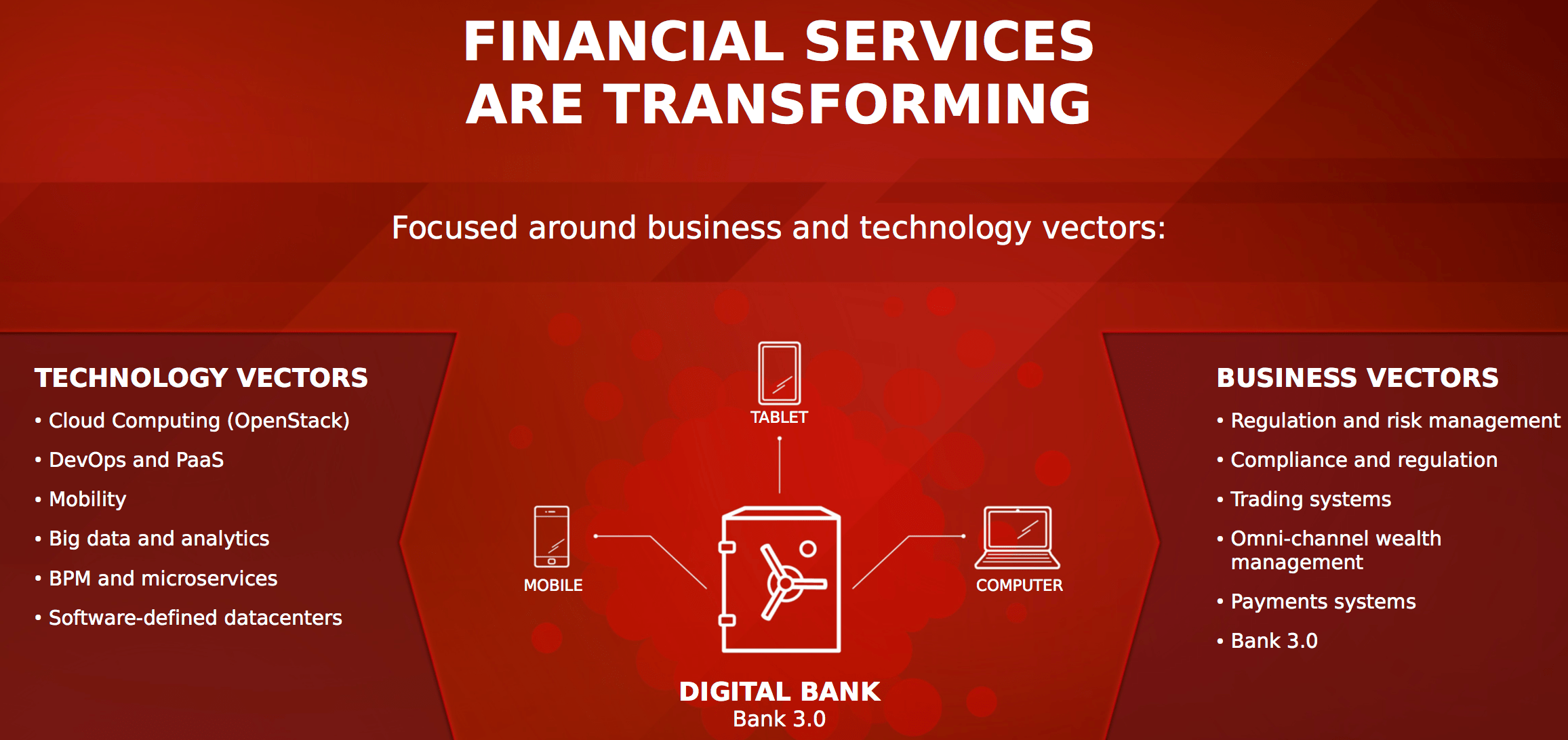 Digital Banking is the age of the hyper-connected consumer. Customers are expecting to be able to Bank from anywhere, be it a mobile device or use internet banking from their personal computer. The business areas shown in the above picture are a mix of both legacy capabilities (Risk, Fraud and Compliance) to the new value added areas (Mobile Banking, Payments, Omni-channel Wealth Management etc).